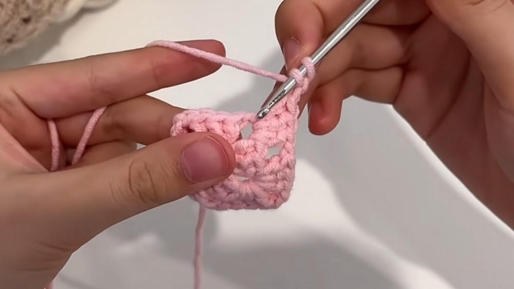 - Repeat the sequence (3 double crochets + 2 chains) to create three more sides.