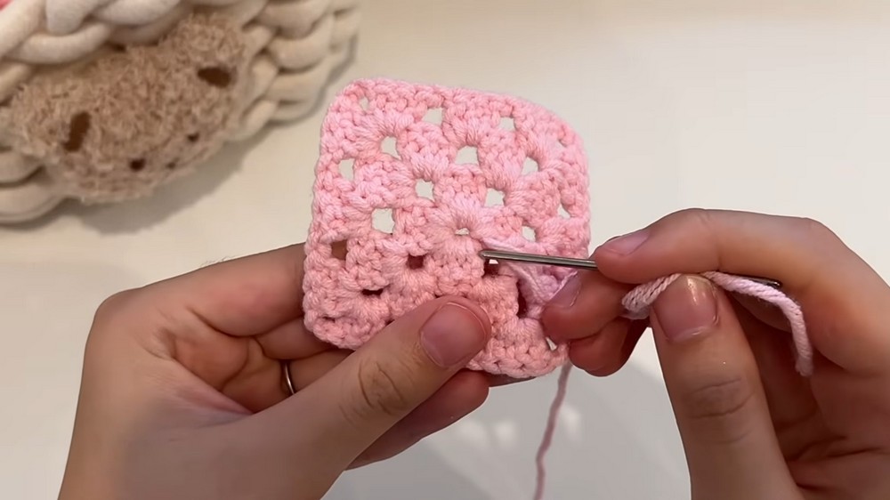 - Use a darning needle to hide tails on the wrong side of the square by threading them through the loops.