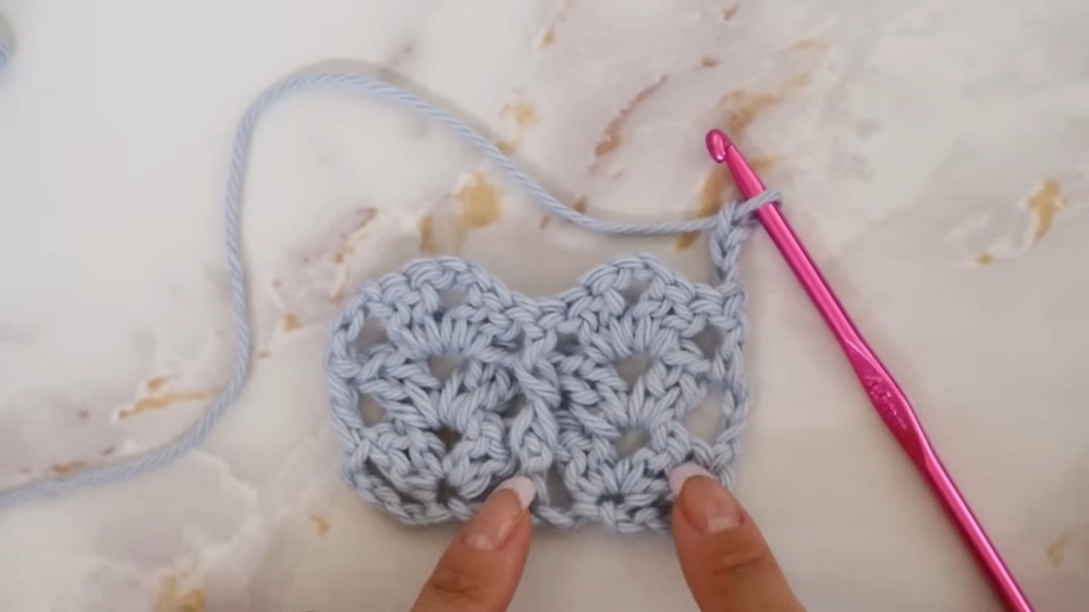 - Double V-Stitch: After chaining 12, chain 3 and place a double V-stitch in the marked third chain. A double V-stitch consists of two double crochets, chain two, and two more double crochets.