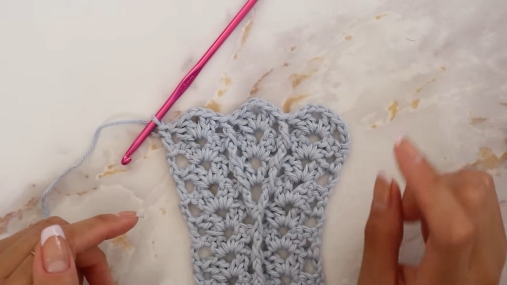 - Increase Rows: Start the seventh row with increases (double V-stitches and additional post stitches per row). For each row, alternate between increase rows and repeat rows.