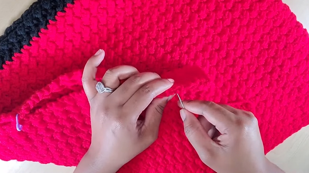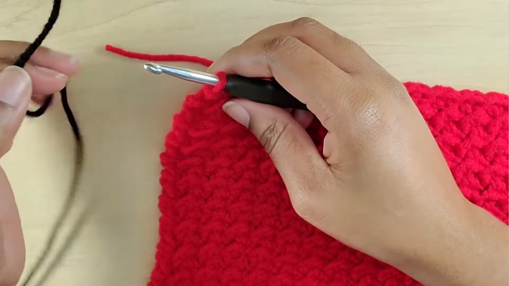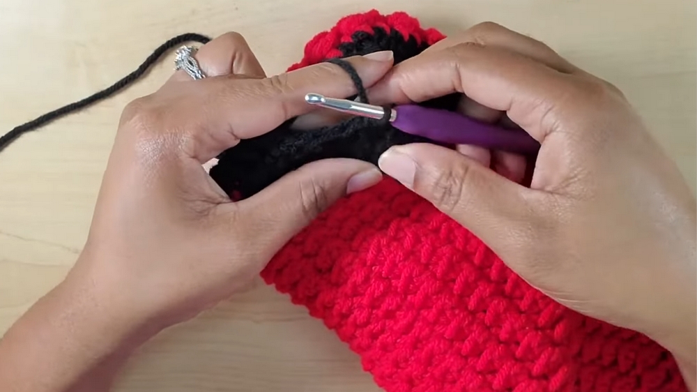 - For the sleeve ribbing, switch to black yarn and create front-post and back-post double crochets for six rows.
