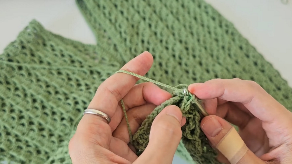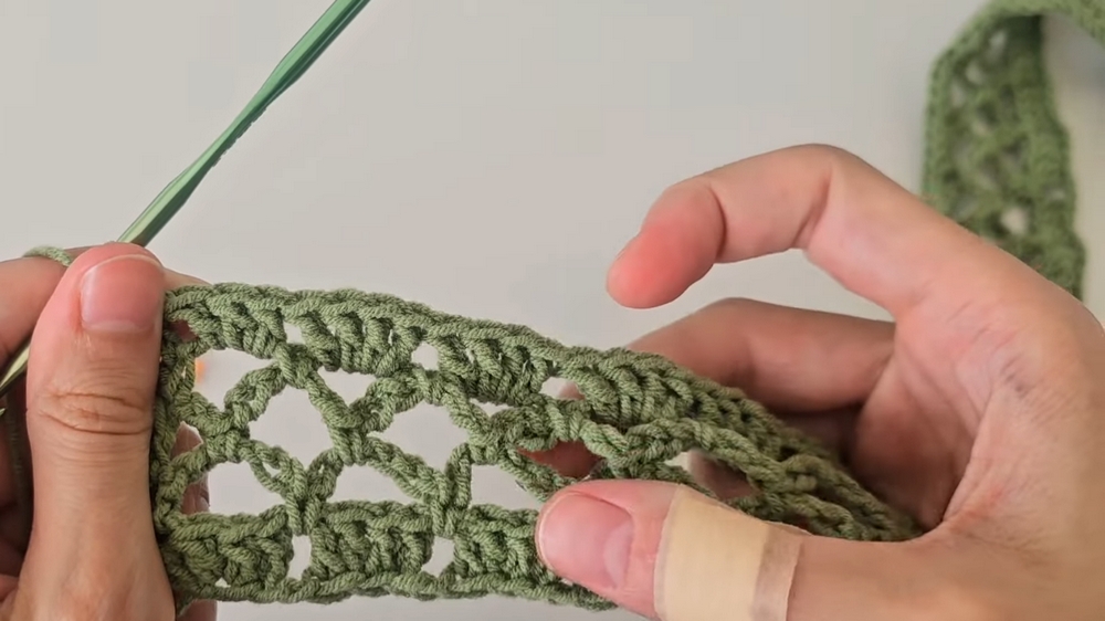 Subsequent rows introduce delicate “braid-like” arches and jumper connections, giving the fabric both texture and an airy, light feel.