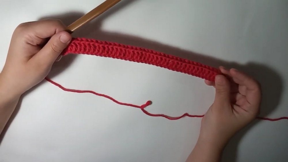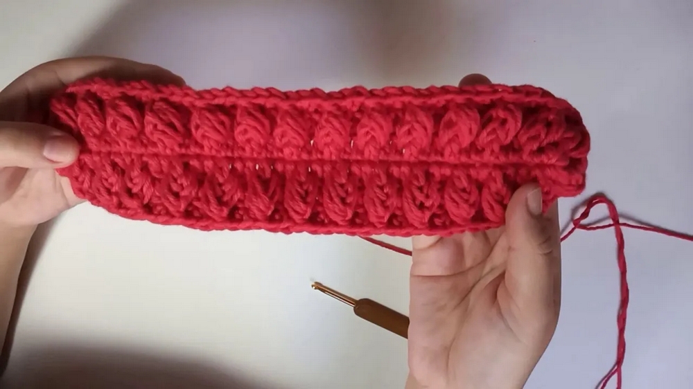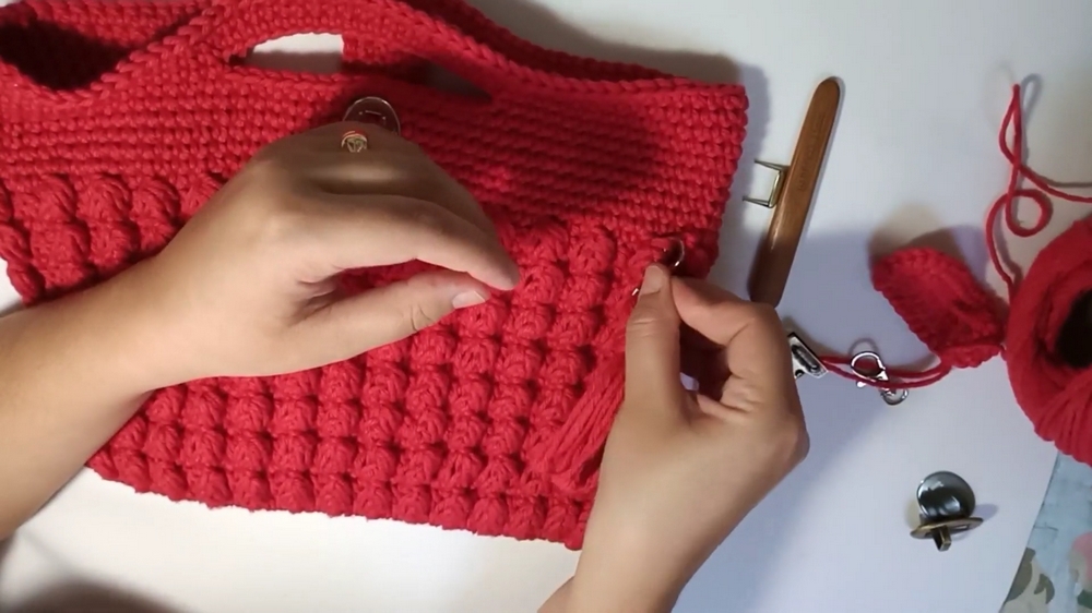 As the height of the bag grows, precisely arranged rows of stitches ensure both symmetry and a smooth finish. Midway through the process, the handles take shape with the addition of 20 chained loops on each side, integrating seamlessly into the body of the bag. This clever design ensures the handles are strong enough to carry weight while maintaining the elegant flow of the pattern.