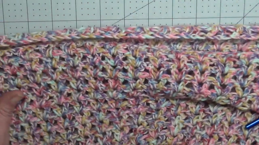- Crochet V stitches on one panel (front or back) and double crochet at the end of rows. Turn the work after chaining 3.