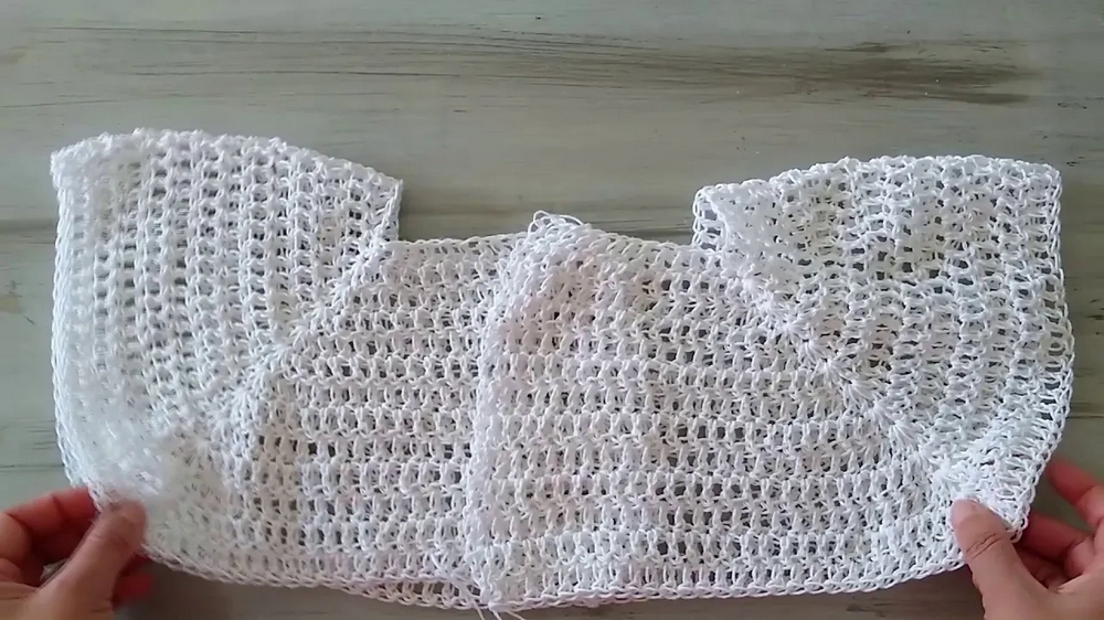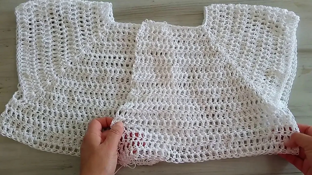 The pattern begins with 68 chains for a medium size, serving as the base for rows of double crochets, which form the airy, open texture. Early rounds introduce strategic increases, shaping the front, shoulders, and back for a seamless fit.
