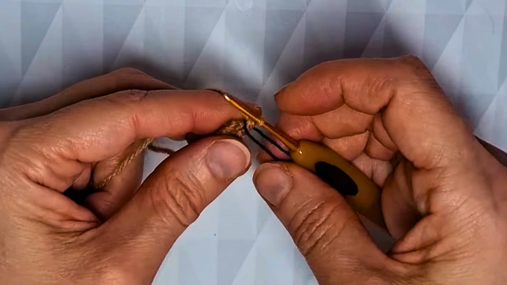 - Find the center point between the legs, and knit a small tail with chain rows and half-columns.
