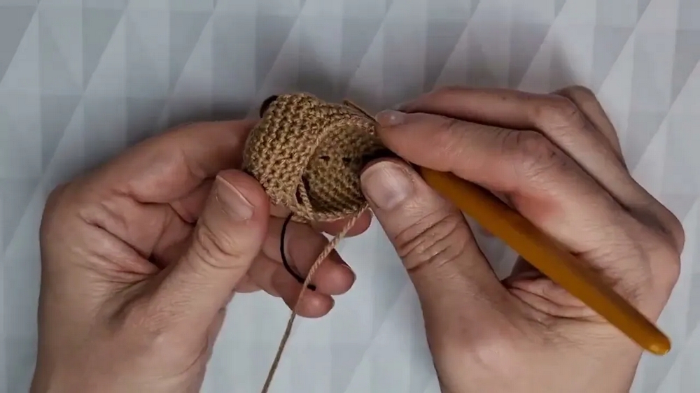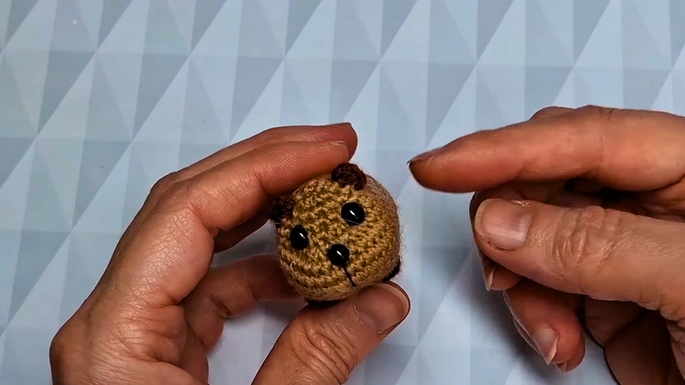 - Ears: Pick loops above the eyes, knit half-double crochets, and tie off the threads.