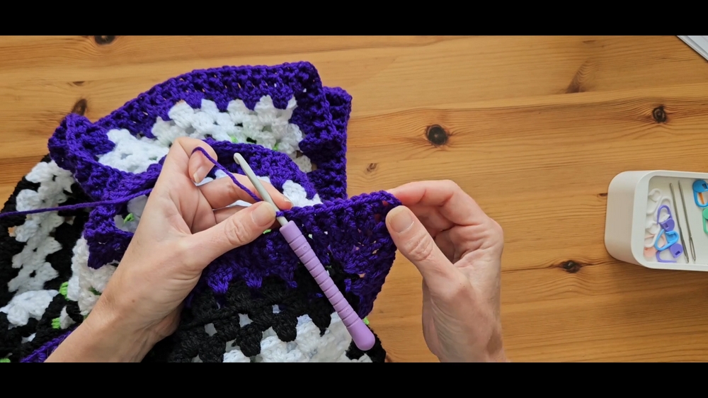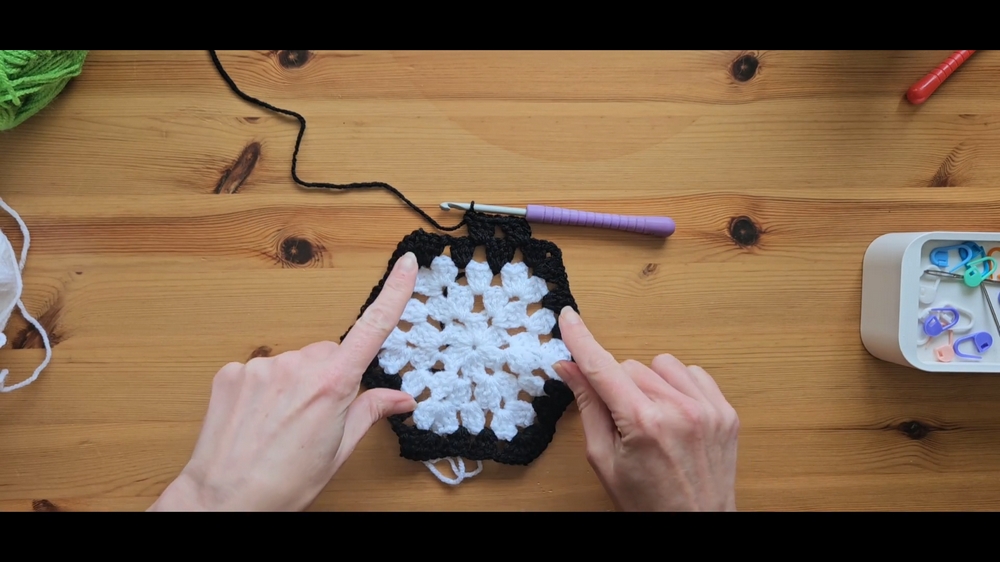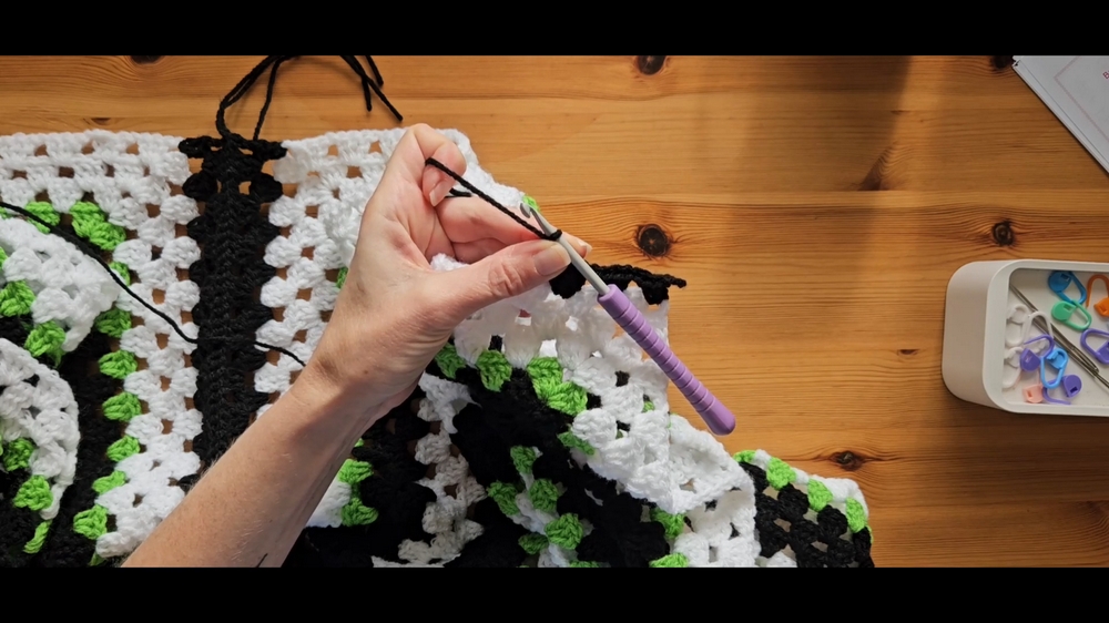 - Fill the back neck area by adding granny stripe rows with black yarn for added comfort and neckline room.