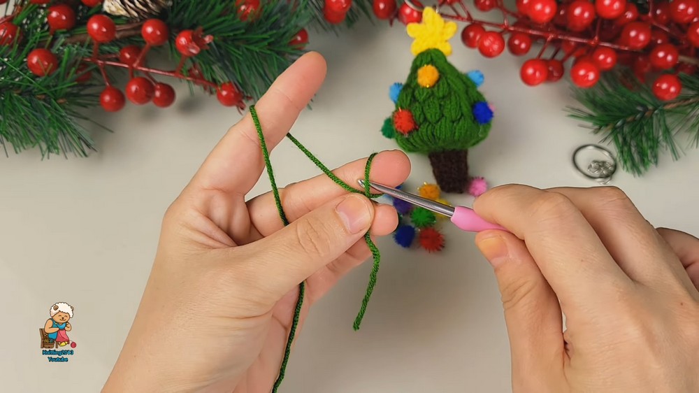 Hiding the Color Change: When switching from the brown trunk yarn to the green tree yarn, perform a seamless or invisible color change to ensure a clean line at the base of the tree.