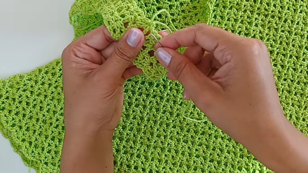 The structured yet soft drape of the garment is built using repetitive stitches, easing the process while maintaining a lightweight feel. Finishing touches involve seamless joins and subtle edging that highlight the skill and care in the project, bringing the entire look together with finesse.
