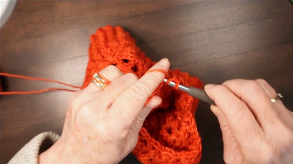 - Work 2 double crochets, chain 1, 1 double crochet into chain spaces.