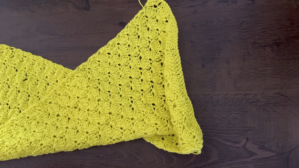 As the rows progress, blocks of five double crochets are interspersed with single crochet stitches, forming a delicate balance of design and strength. The rhythm of working two types of rows, one focusing on double crochets and the other embracing shell stitches, paves the way for a visually dynamic and functional fabric pattern.
