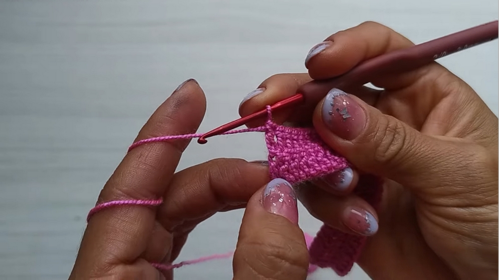As the yoke progresses, the stitches transition smoothly into double crochets, adding texture and enhancing the top’s overall drape