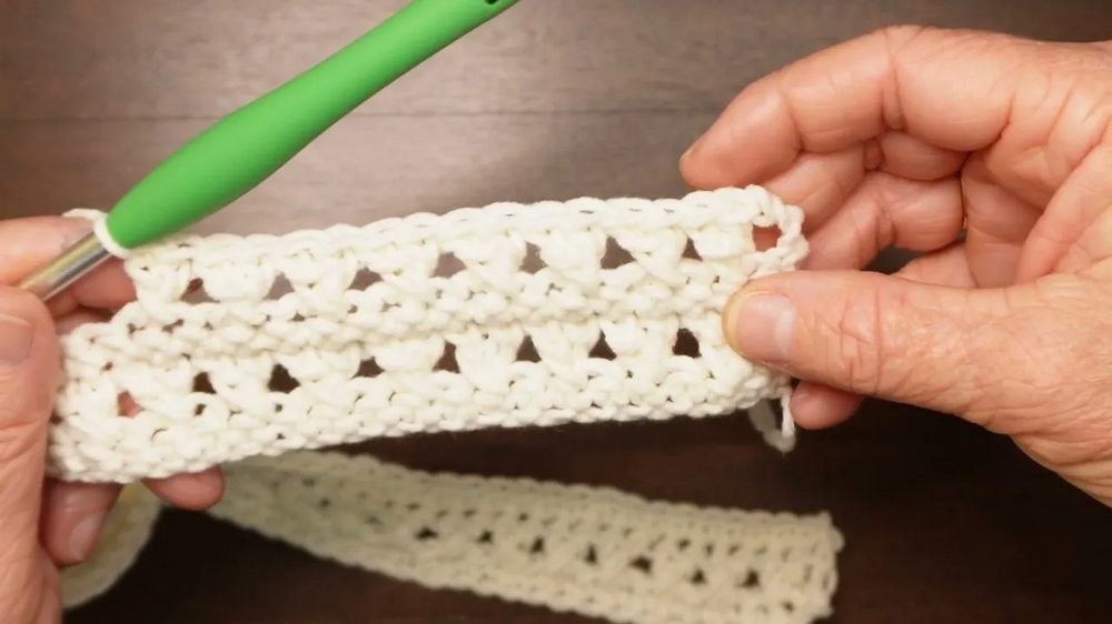 - Repeat Row 2 (crossed double crochet row) and Row 3 (single crochet row), alternating between them for a total of 32 rows.