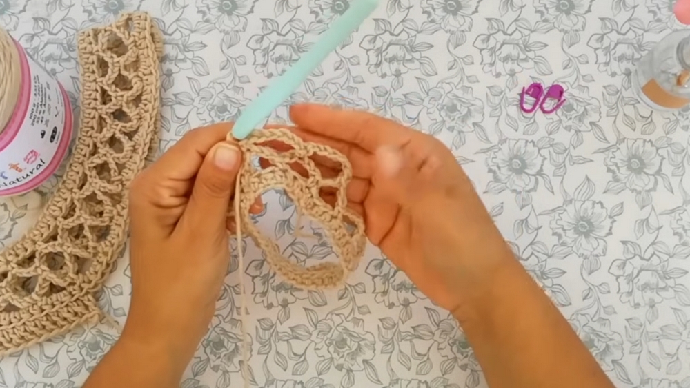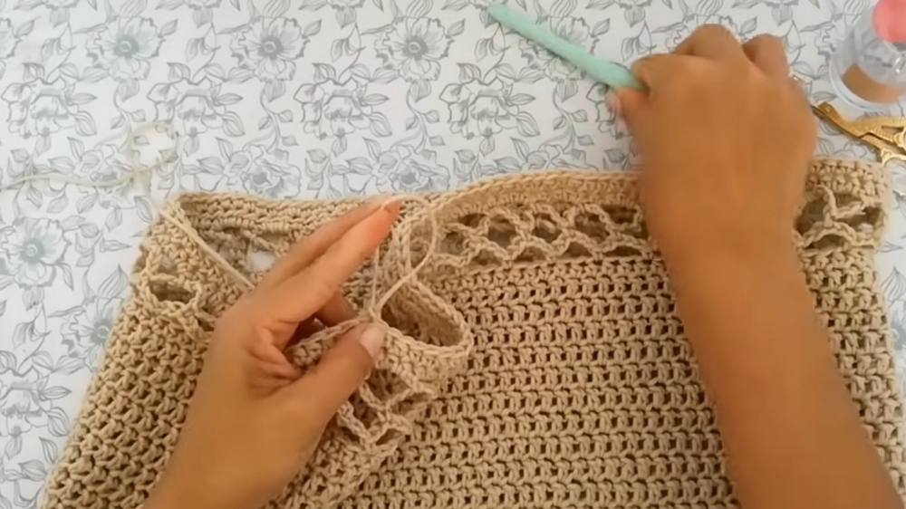 - Rejoin the working thread at the back piece. Crochet chains for the sleeve's cuff space (e.g., 13 chains for medium size).