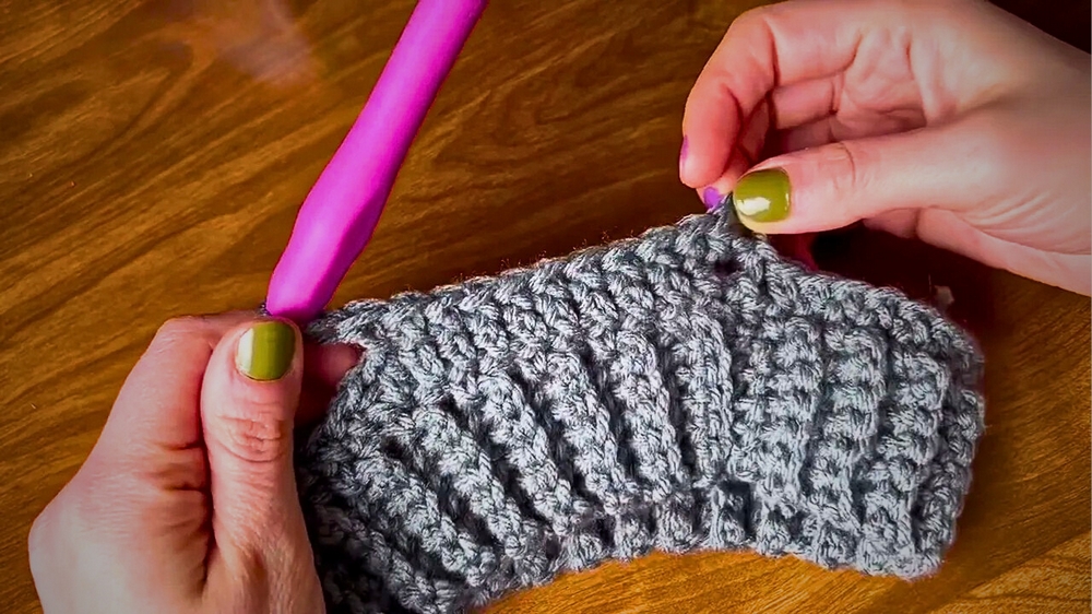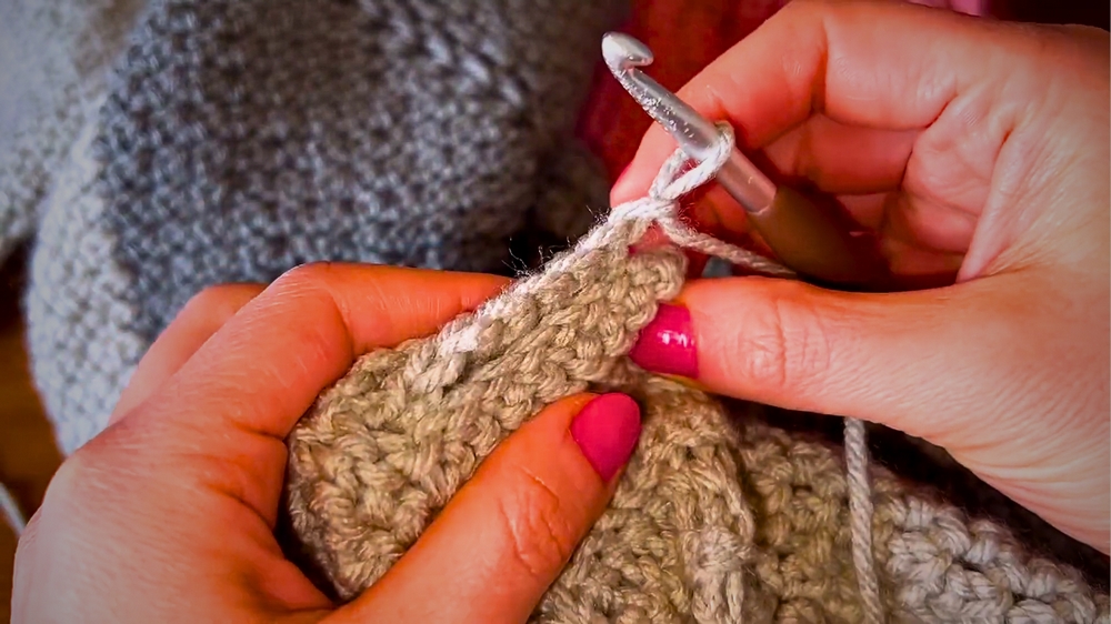 - Change Colors: Switch to different colors of yarn as the tutorial progresses, creating sections of dark gray, light gray, and coral pink with 16 rows each.