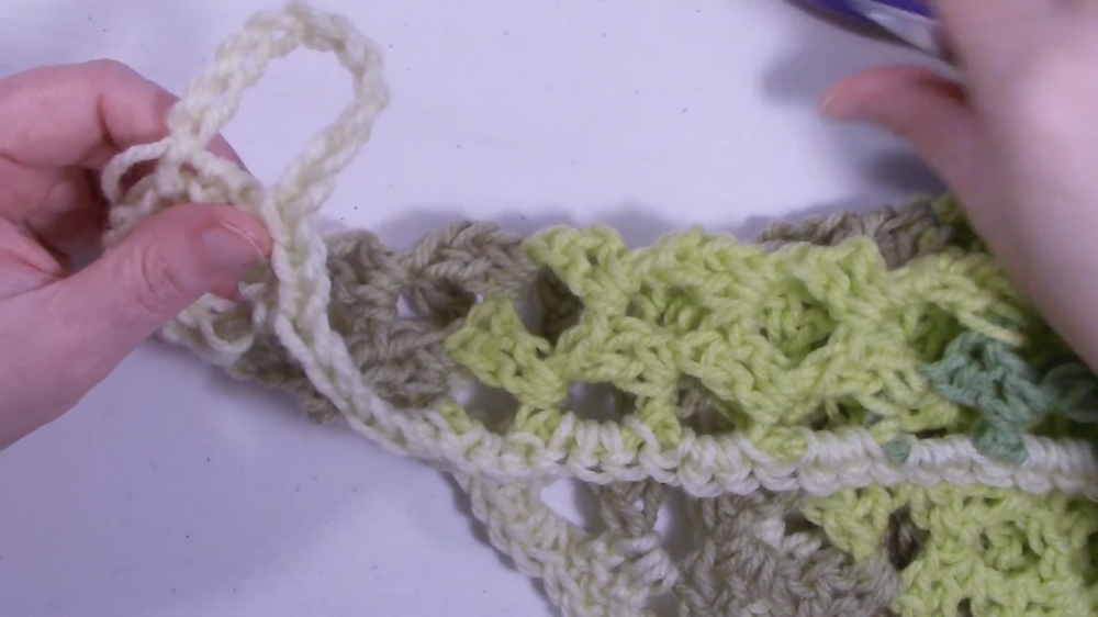 - At the final corner, chain 10 again, slip stitch into the chain space, and fasten off.