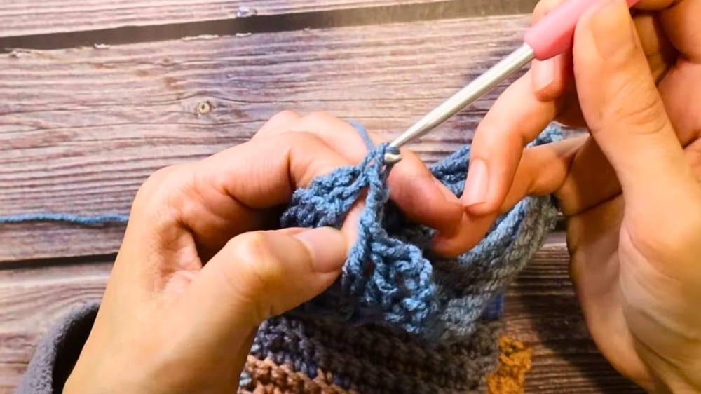- Row 2: Chain 2 spaces, single crochets, and finish the double crochet clusters.