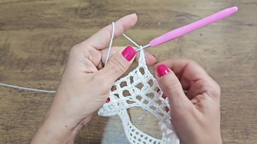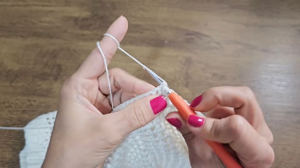 The blouse features evenly spaced double crochet stitches harmoniously paired with chain stitches to create a light and breathable fabric. Small but significant V-stitches are strategically placed to provide structure and add aesthetic appeal. These V-stitches later evolve into fans, which offer additional decorative detail as the blouse takes shape. A circular yoke layout ensures each row maintains an even shape, making the top-down technique practical and efficient.