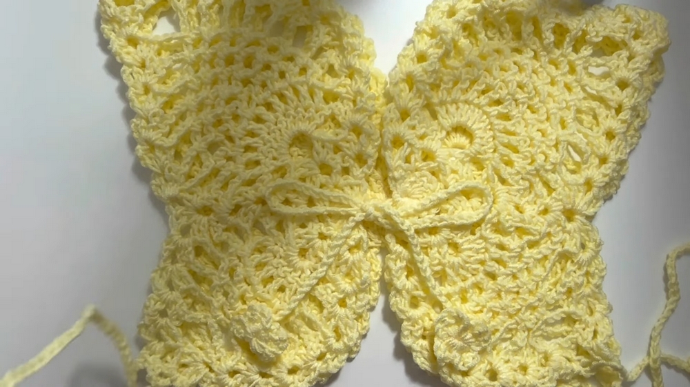 The garment’s intricate construction makes it stand out with its clever play of symmetry and texture. Starting with a magic circle foundation, a hallmark of crochet artistry, it transitions into layers of double crochet stitches accentuated by chain stitches, forming the unmistakable butterfly wing motif.