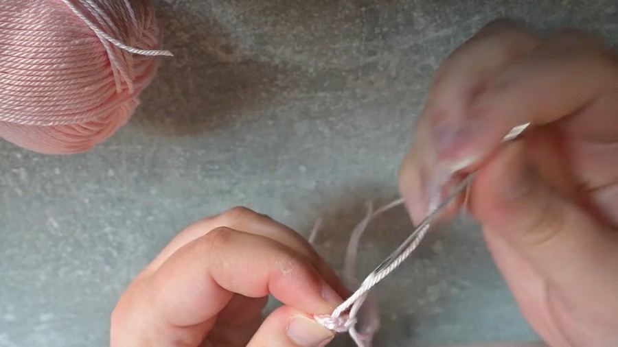 - Make a pink magic ring with 6 SC.