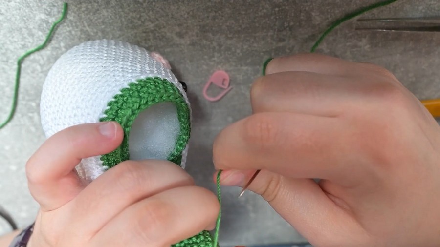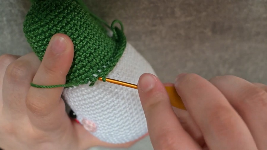 - Round 28: Change to green yarn and work BLO (Back Loop Only) with 1 SC in each stitch (56 stitches).