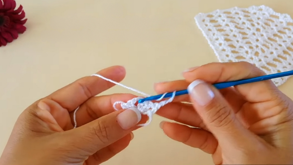 - Start with 7 chains, and create a double crochet fan using two double crochets, two separating chains, and two more double crochets in the same stitch.