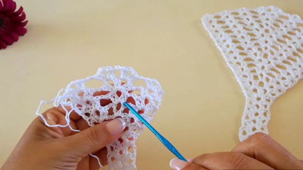- Continue until the desired length is reached. For small sizes, 18 fan rows after the neckline are suggested. Add more rows for larger sizes.