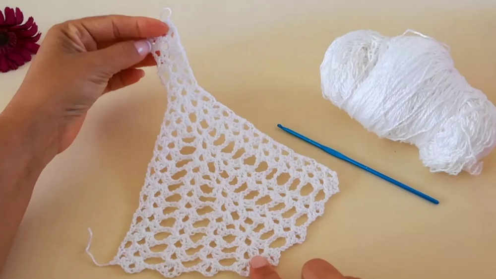 - Continue forming 6 rows of identical fans (2dc-2ch-2dc).