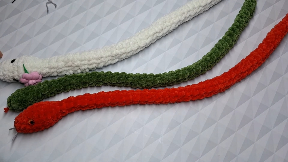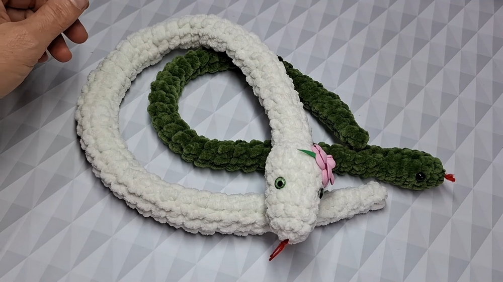 Midway through, adjustments in stitch style help modulate its texture, imitating the visual appeal of scales while maintaining the softness of the yarn. Adding carefully embroidered eyes infuses life into the snake, making it endearing and vibrant.