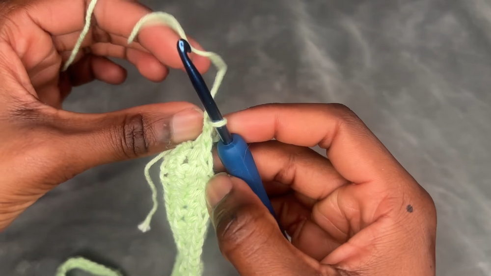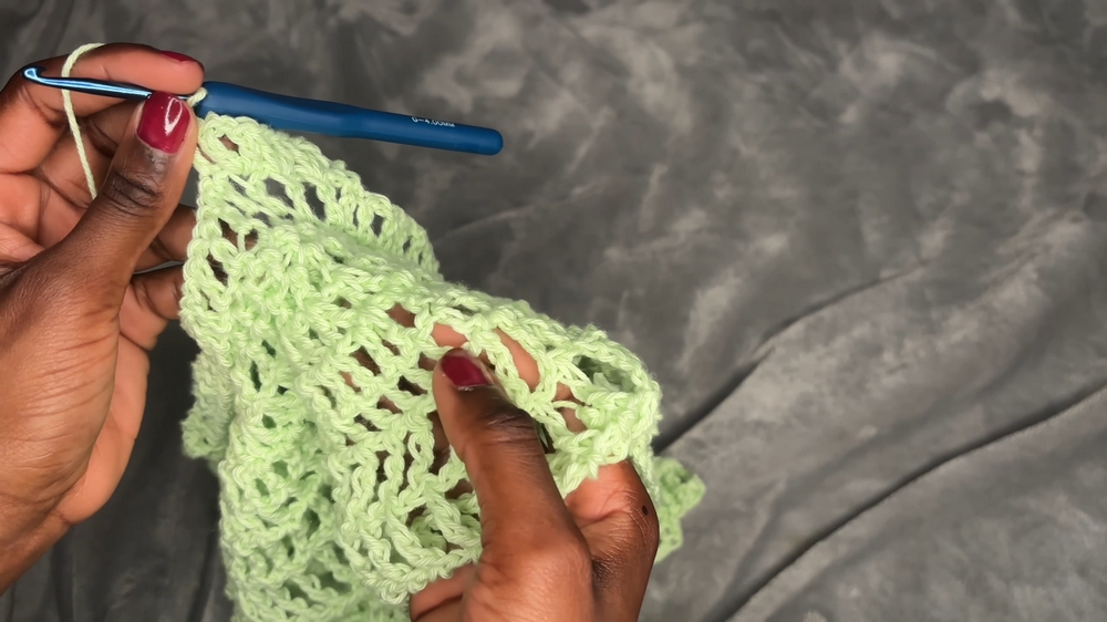 - Chain 4, turn the work, and alternate between chain-1 spaces and double crochets in every stitch (no skipping).