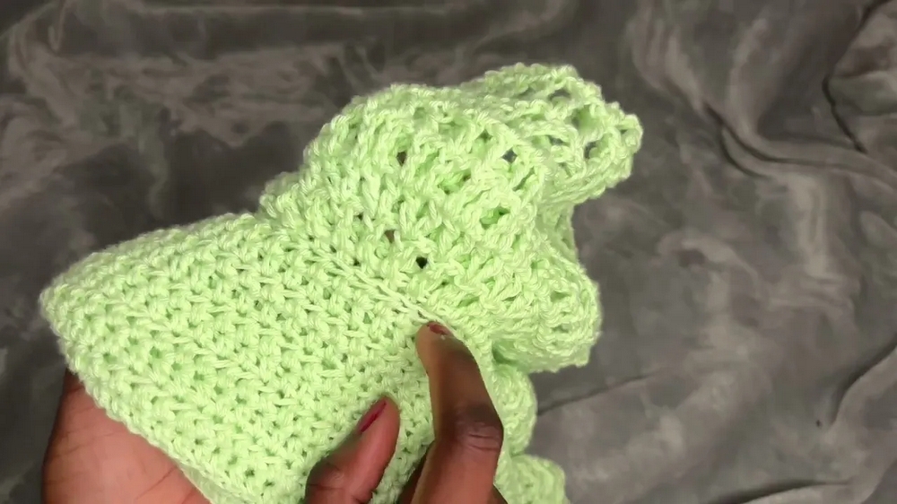 - Attach yarn at the seam line and crochet double stitches integrated with chain spaces into the front loops.