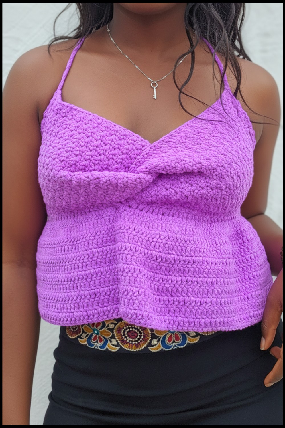 The Twisted Peplum Crochet Top is a versatile and stylish piece that is both flattering and comfortable. This project is perfect for intermediate to advanced crocheters who enjoy creating intricately designed yet wearable garments. The alternating SC/DC pattern adds texture, while the twisted design creates a unique aesthetic.