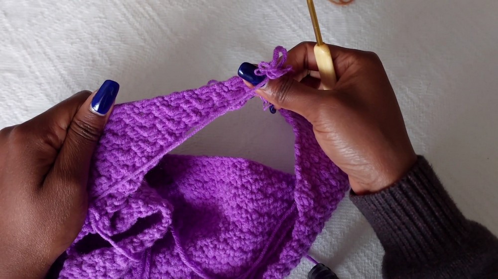 - Work rows of double crochet into a chain, creating straps long enough to crisscross or tie at the back.