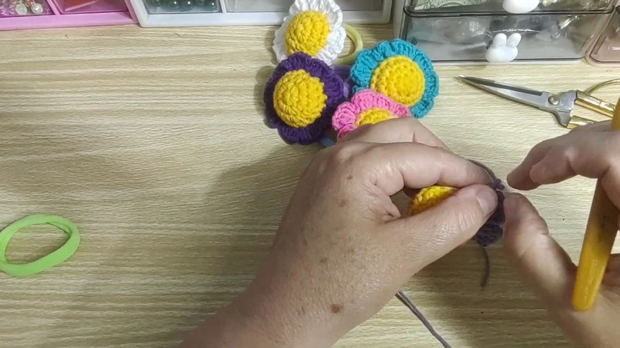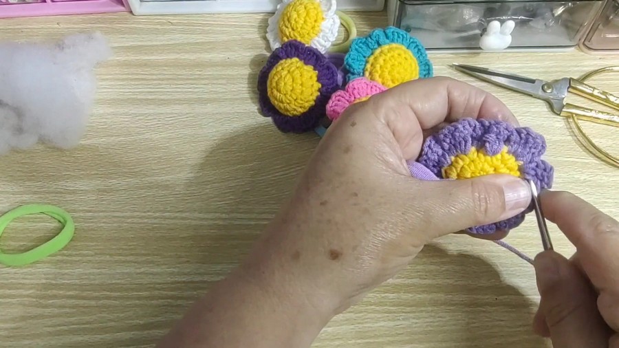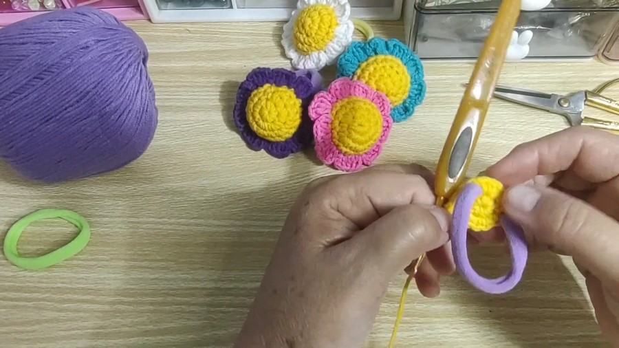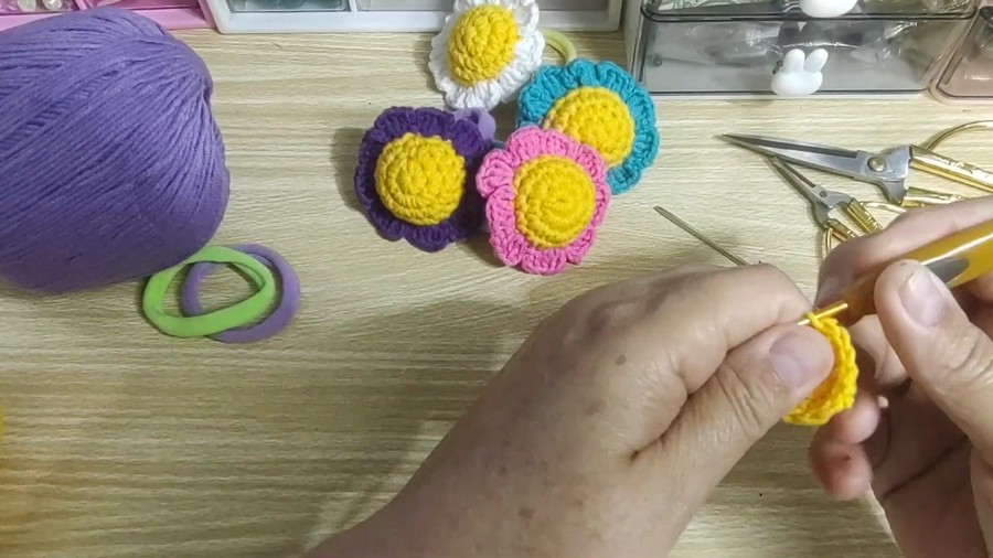 - Repeat this process (ch 3, sl st, 3 hdc, sl st) to create petals around the entire scrunchie.