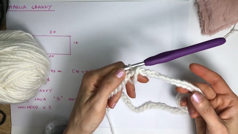 - Create a base chain of 72 stitches for a size S (adjust for larger sizes). The chain must form a circumference of 60 cm to ensure the neckline comfortably fits over the head.