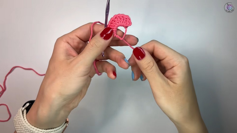 - Chain 2 (counts as the first dc), and crochet 1 dc into the same stitch (increase).