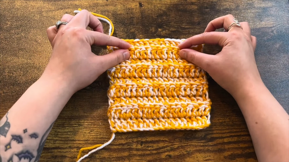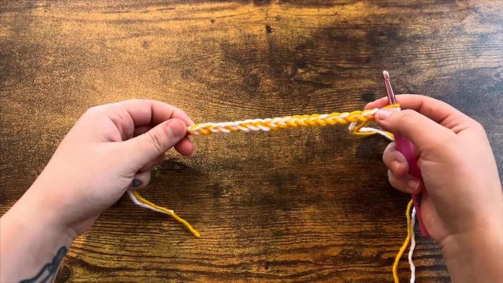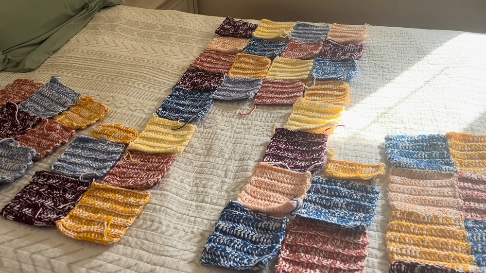 The project begins with chaining stitches and crocheting rows of double crochet, creating squares that are consistent and uniform in size.