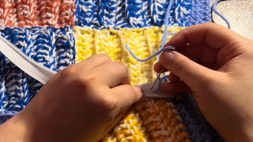 Once completed, the squares are pieced together with a seamless mattress stitch that provides durability and a polished finish. This assembly technique ensures that the garment maintains its structure while allowing flexibility for ease of movement.