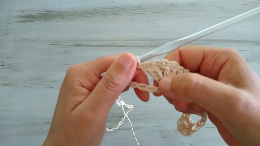 - Create 6 chains in the air, skipping 6 spaces, and make another elongated double crochet into the 7th space.