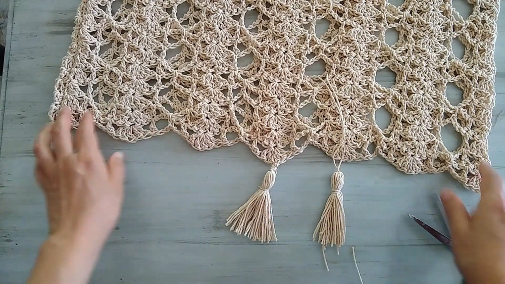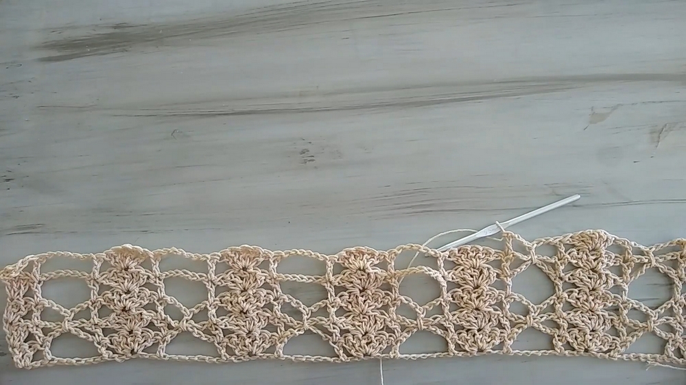 - From every subsequent row, repeat using a similar approach—creating elongated double crocheted spaces and fans while maintaining the designated counts between stitches.