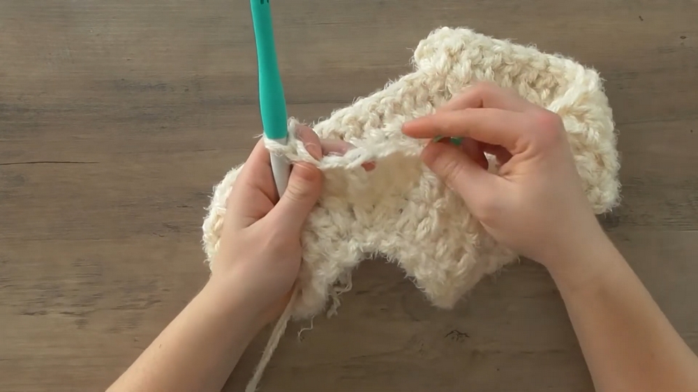 This poncho is constructed in the round, using two strands of Red Heart Hygge yarn held together to create an extra-plush fabric that feels luxurious against the skin. It starts with a foundation chain of 46 stitches, carefully joined to form a round.