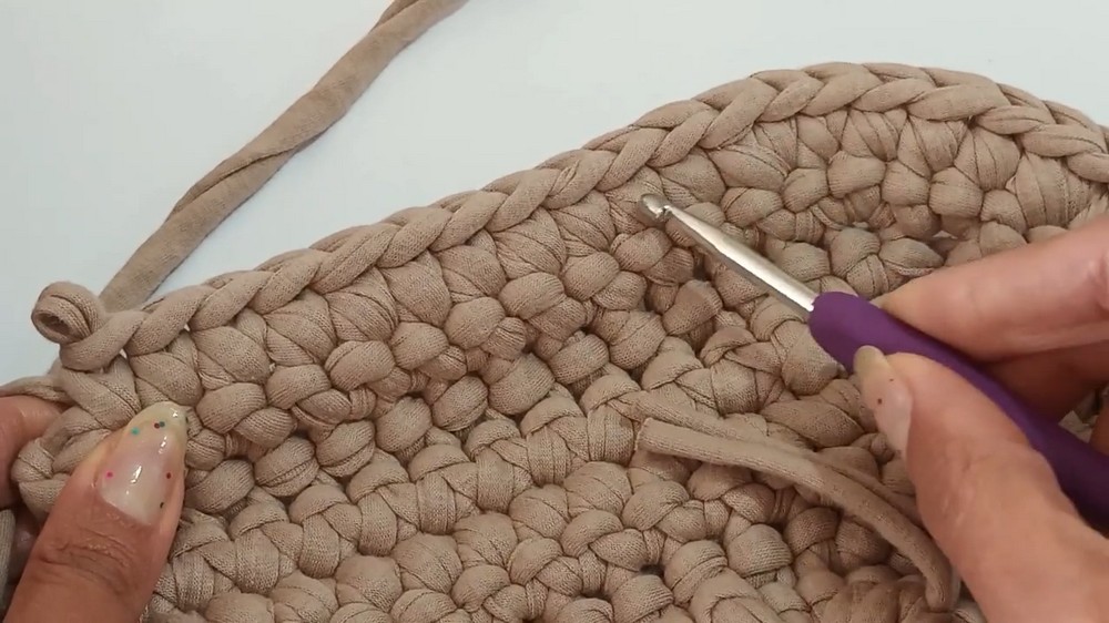 - As rows progress, include row increases at the corners by working 2 SC into the same stitch to create space and widen the bag.