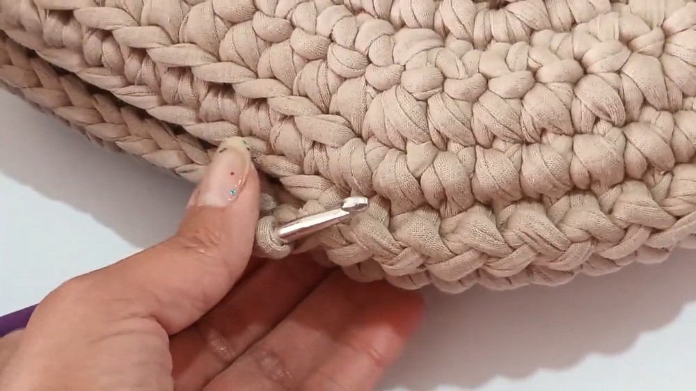 - Following the single-row pattern, make 4 single crochets into the same center stitch to create a curve for the bag’s base.