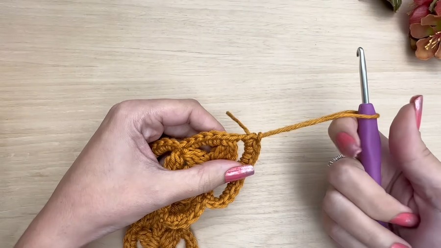 - Repeat the same method of petal creation by ch 6 into the edges below.