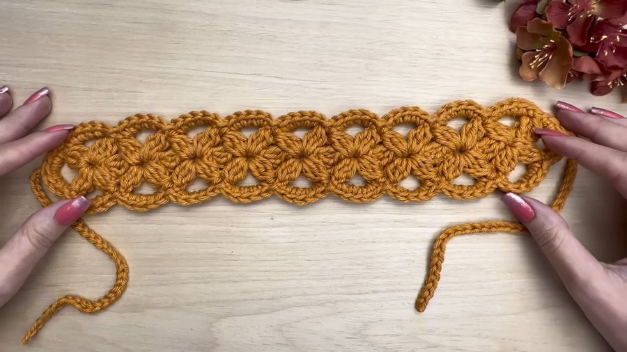 - Size: Finished band measures 32.5 cm wide and 6 cm high with the suggested yarn and hook size.