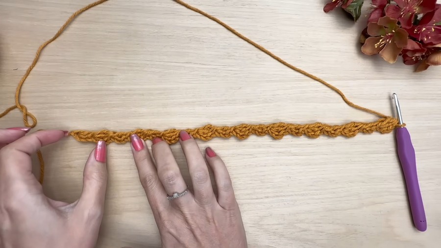 - From the last edge/loop, attach yarn and chain to make a 35-chain cord string.