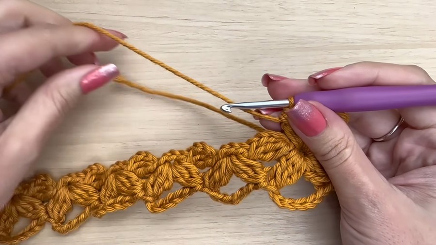 - Repeat fans across alternating 2-stitch blocks, leaving 3-stitch areas unworked.