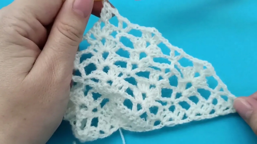 Midway through the pattern, the focus shifts to rows of structured stitching, balancing intricate detailing with stability. Here, double crochets alternate with enchanting arches, leaving spaces that lend the shawl its lightweight and airy texture.