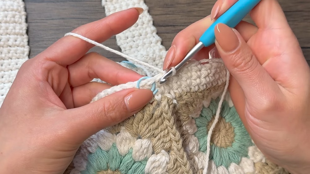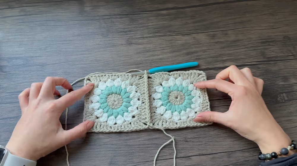 - SC across the adjoining edges, making sure to pick up both stitches from each square.